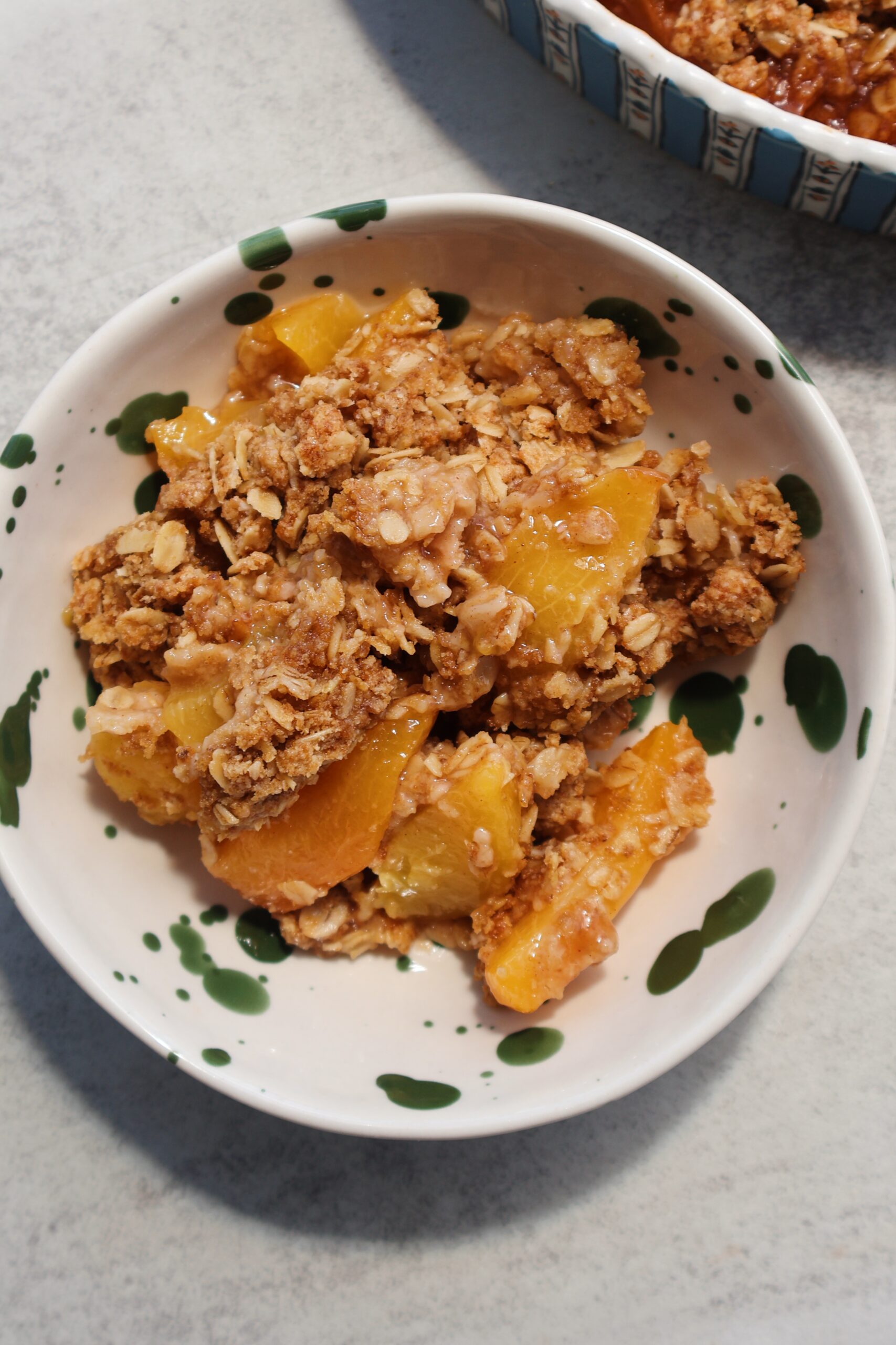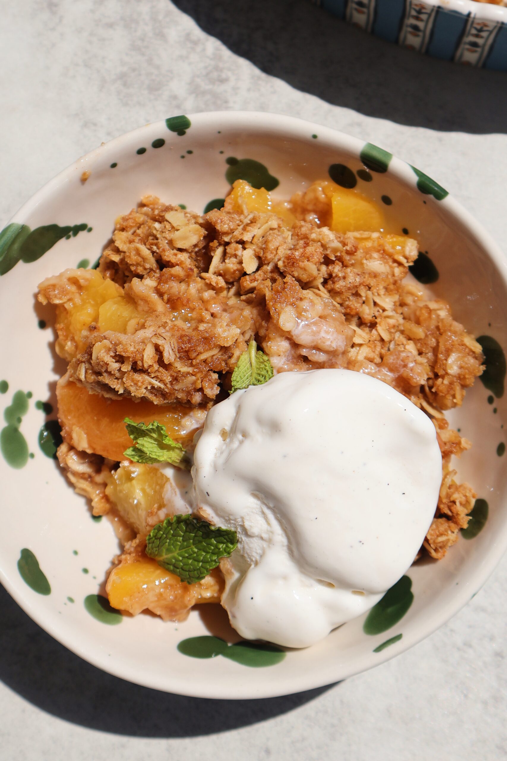 The best vegan and gluten-free peach crumble, made with fresh peaches and an oat flour topping. This simple recipes is my ideal summer dessert served with vanilla bean ice cream.
