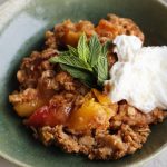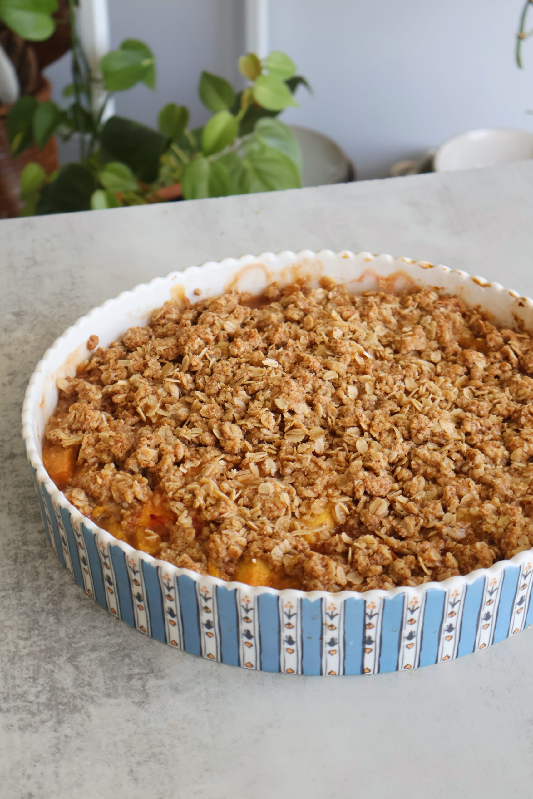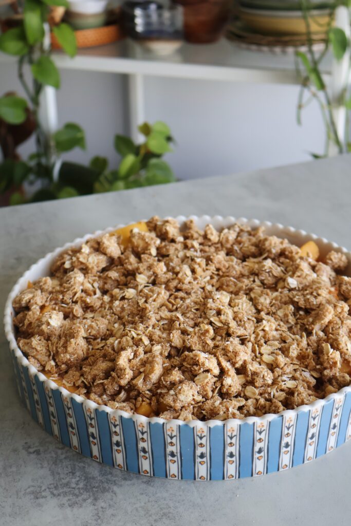 The base of peaches is sweetened with maple syrup and cinnamon, then topped with a cookie like oat topping. It’s a dessert that never disappoints, and is always on my dinner party menu.