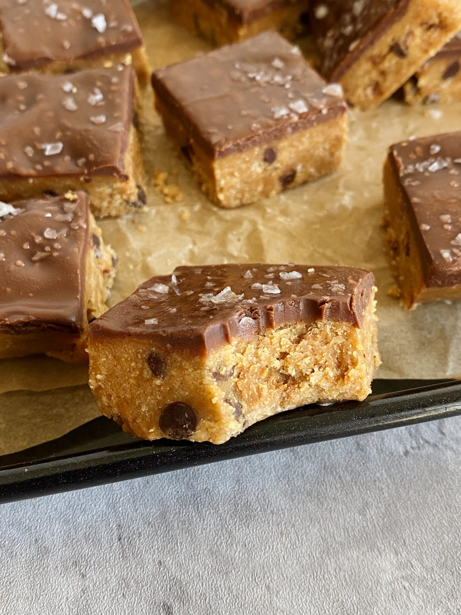 Simple and delicious peanut butter cookie dough bars! The perfect little bites to keep in your freezer when you need a sweet and salty fix.