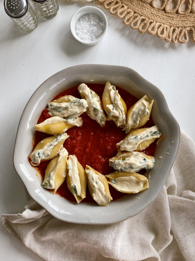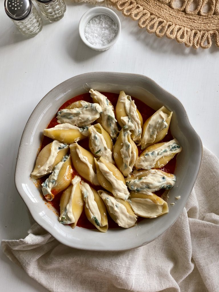- Stuff your shells– once your tofu is made and mixed in with the spinach, begin stuffing your shells with the ricotta mixture