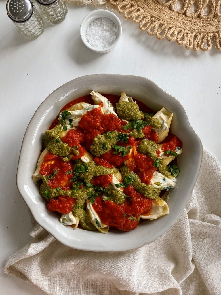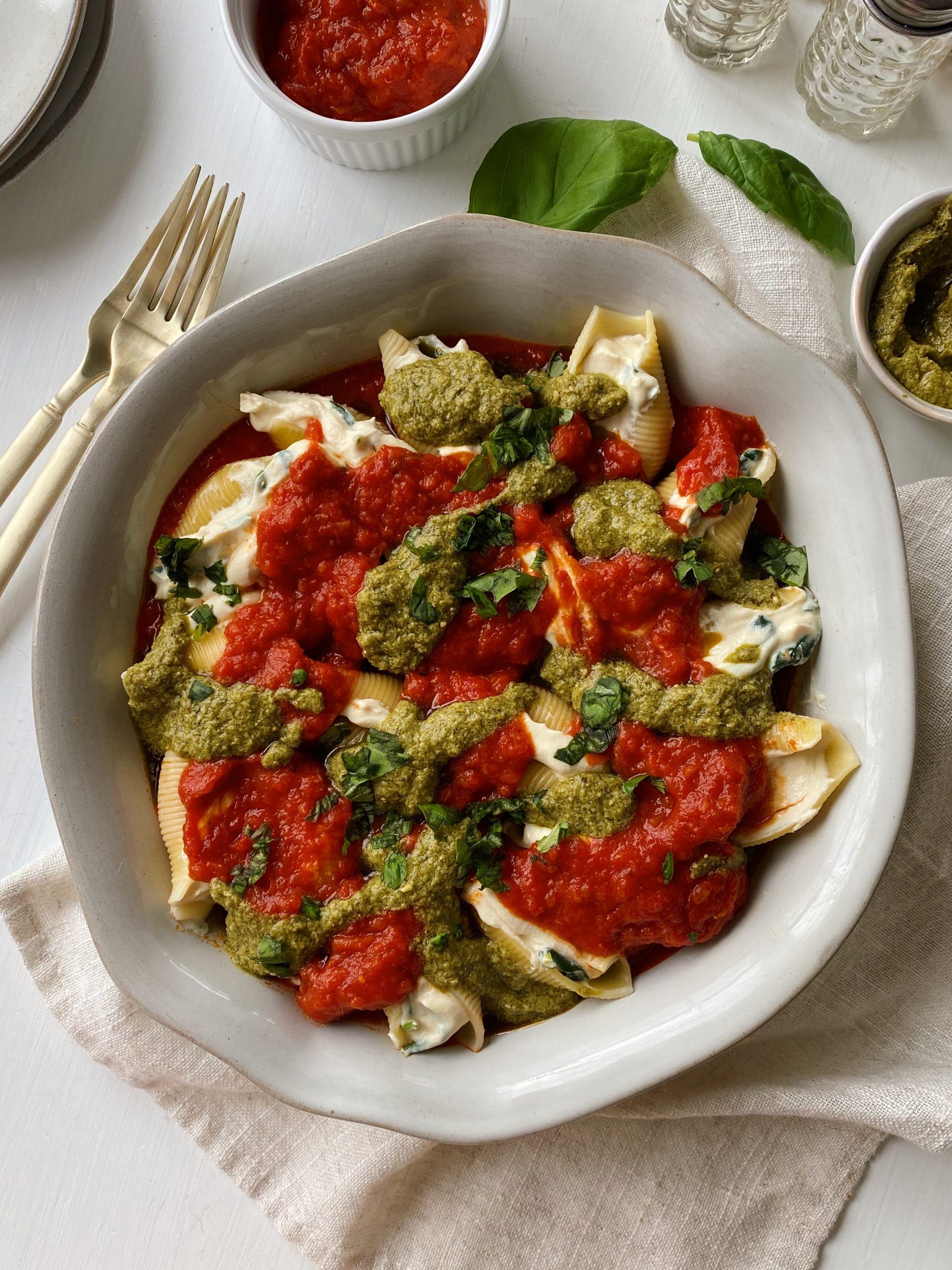 - Layer and bake– layer your shells in a baking dish coated in marinara sauce, then top them off with more sauce and some pesto- you can use store bought or homemade!