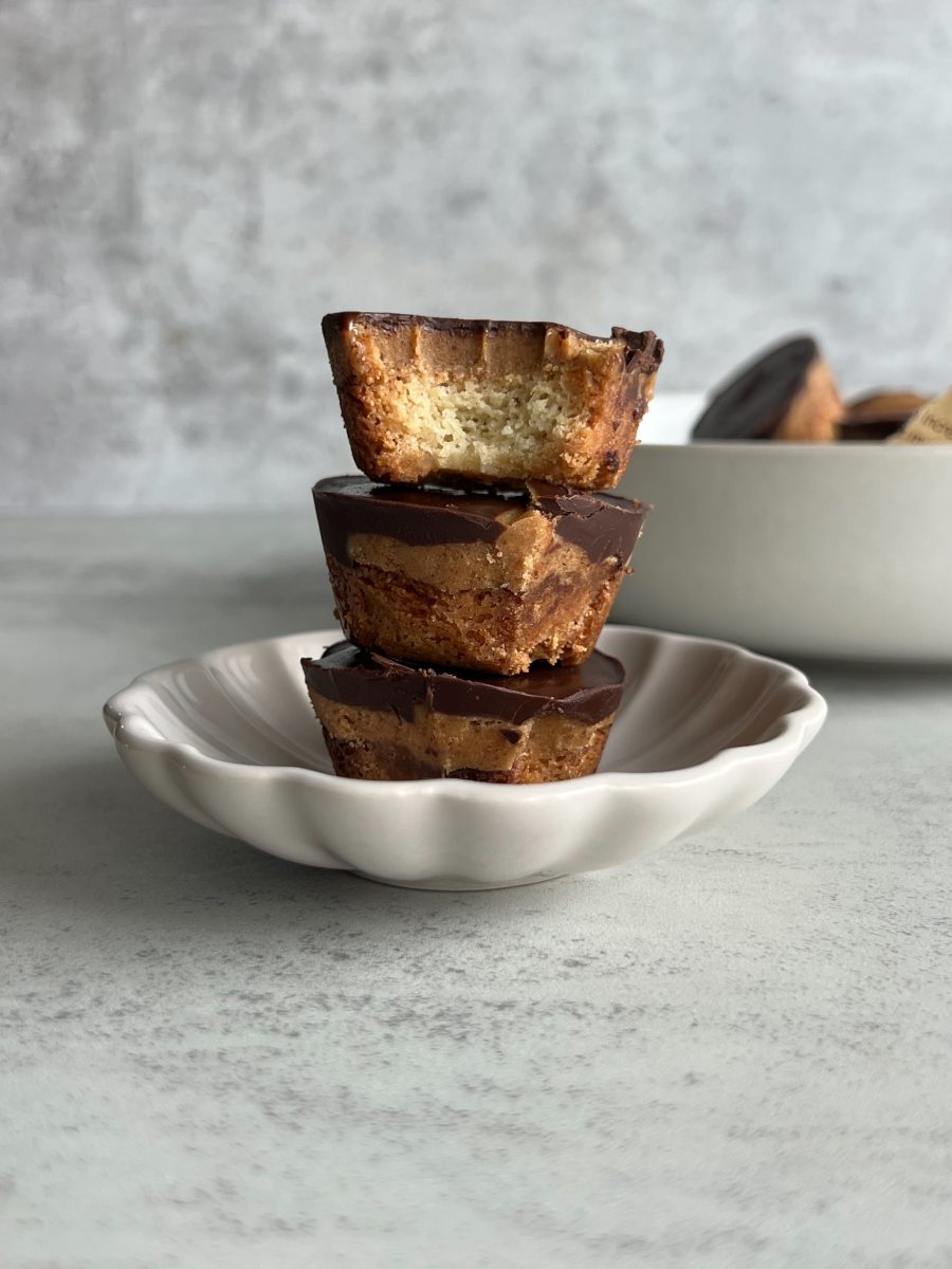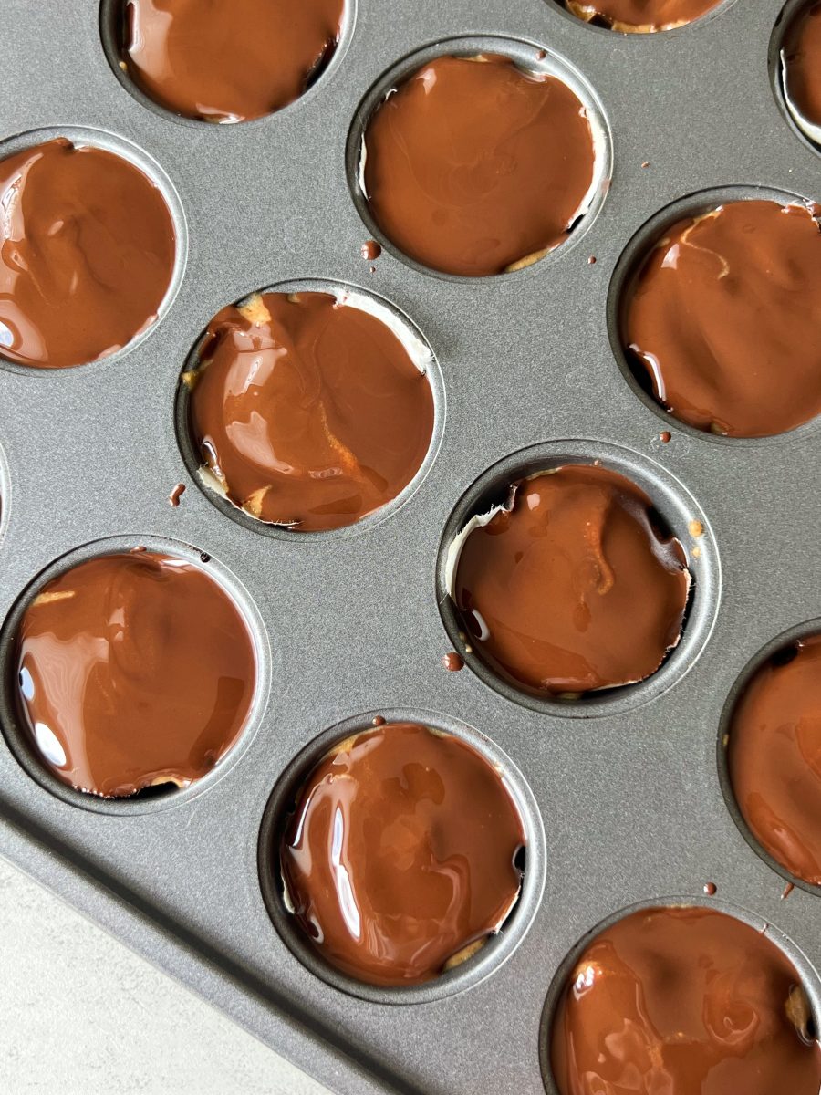 The crust is made from a blend of almond flour, coconut flour, coconut oil and maple syrup. The caramel is a mixture of cashew butter, almond butter, maple syrup, coconut oil and vanilla. All you do is bake the crust in mini muffin liners and top it with the creamy caramel and a layer of melted chocolate.