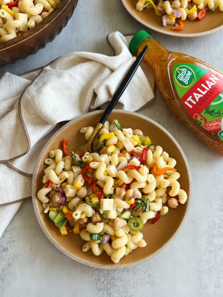 While pasta salads are so customizable, one thing I love to do to keep them consistent is to use a store-bought dressing. Wish-Bone Italian dressing has been a favorite of mine for so many years. It adds the most delicious flavor to the pasta salad without being overbearing, and complements the ingredients so well.