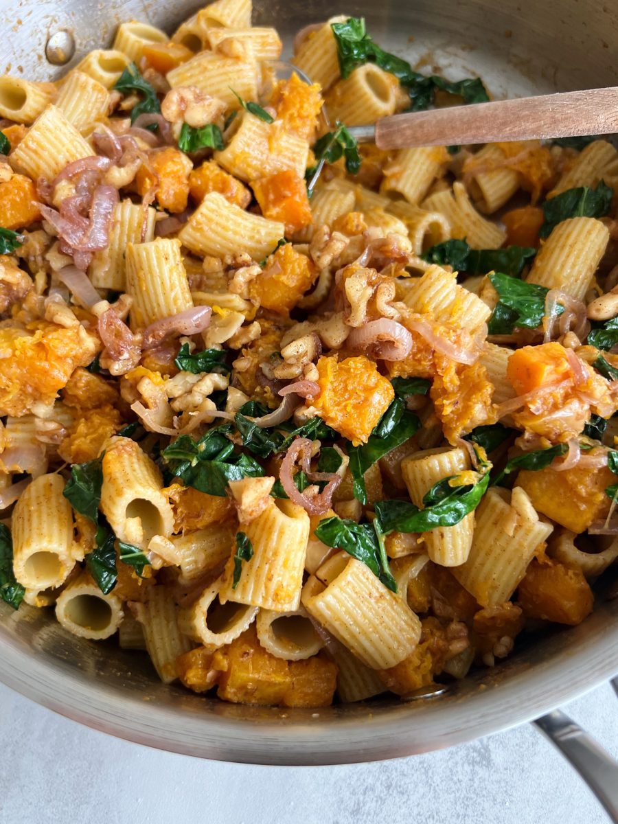 With harvest season in full swing, I’m always craving dishes that are rich with flavor, variety, and nourishing ingredients. This cozy pasta dish is filled with just that, including cinnamon roasted butternut squash, toasted walnuts, and all the warm spices.