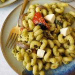 - Once the pesto is ready, stir it into the pasta with the roasted veggies and the fresh mozzarella. Serve fresh warm or cold!