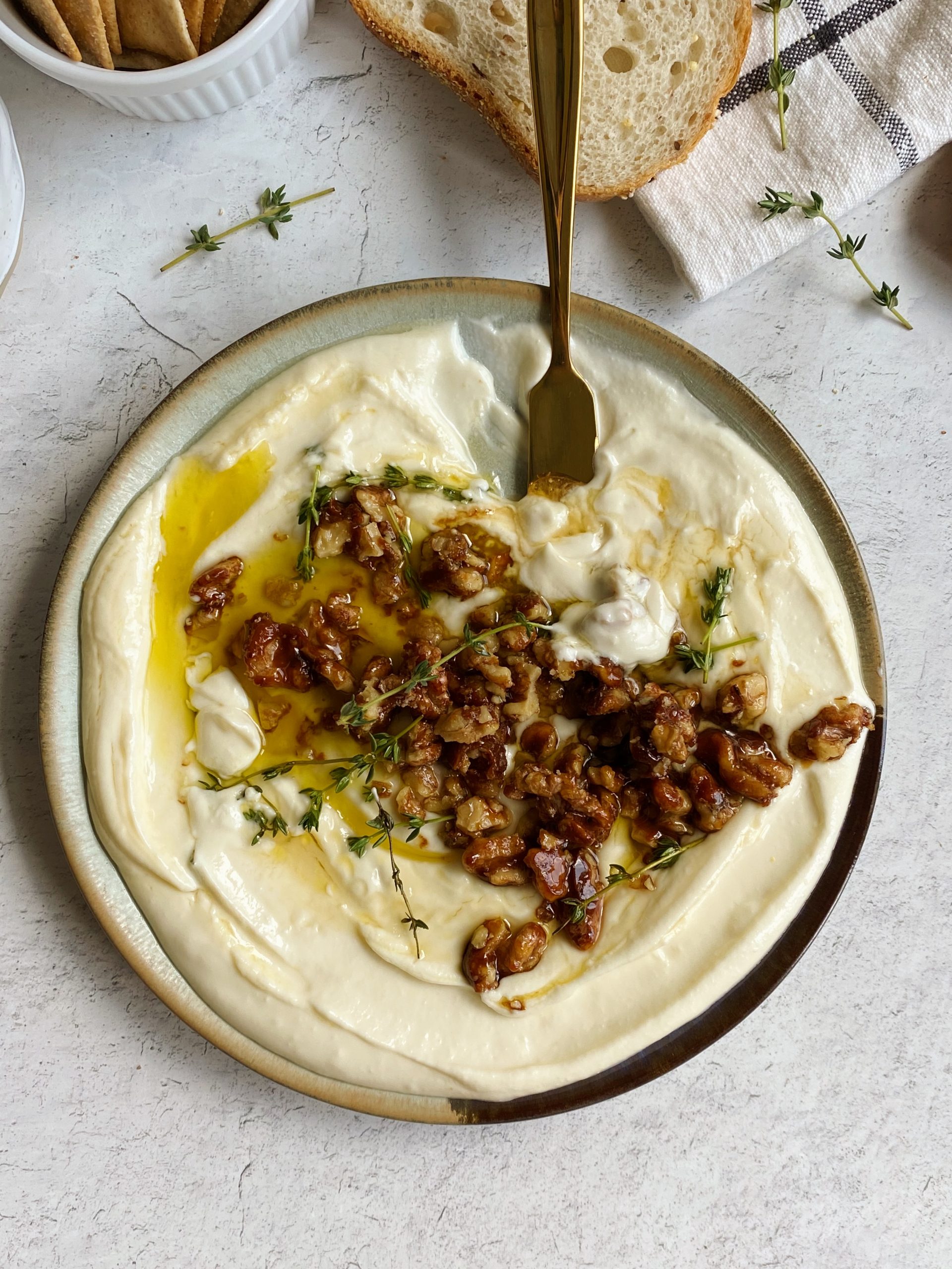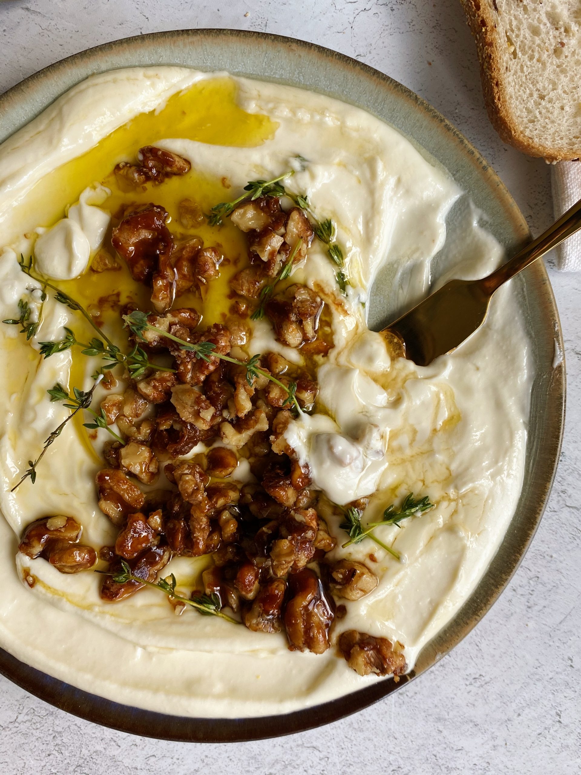 - Once the dip is smooth and creamy, spoon it into a shallow plate or bowl. Pour the honey walnuts over the center, then top it with a drizzle of honey, olive oil and some thyme.