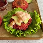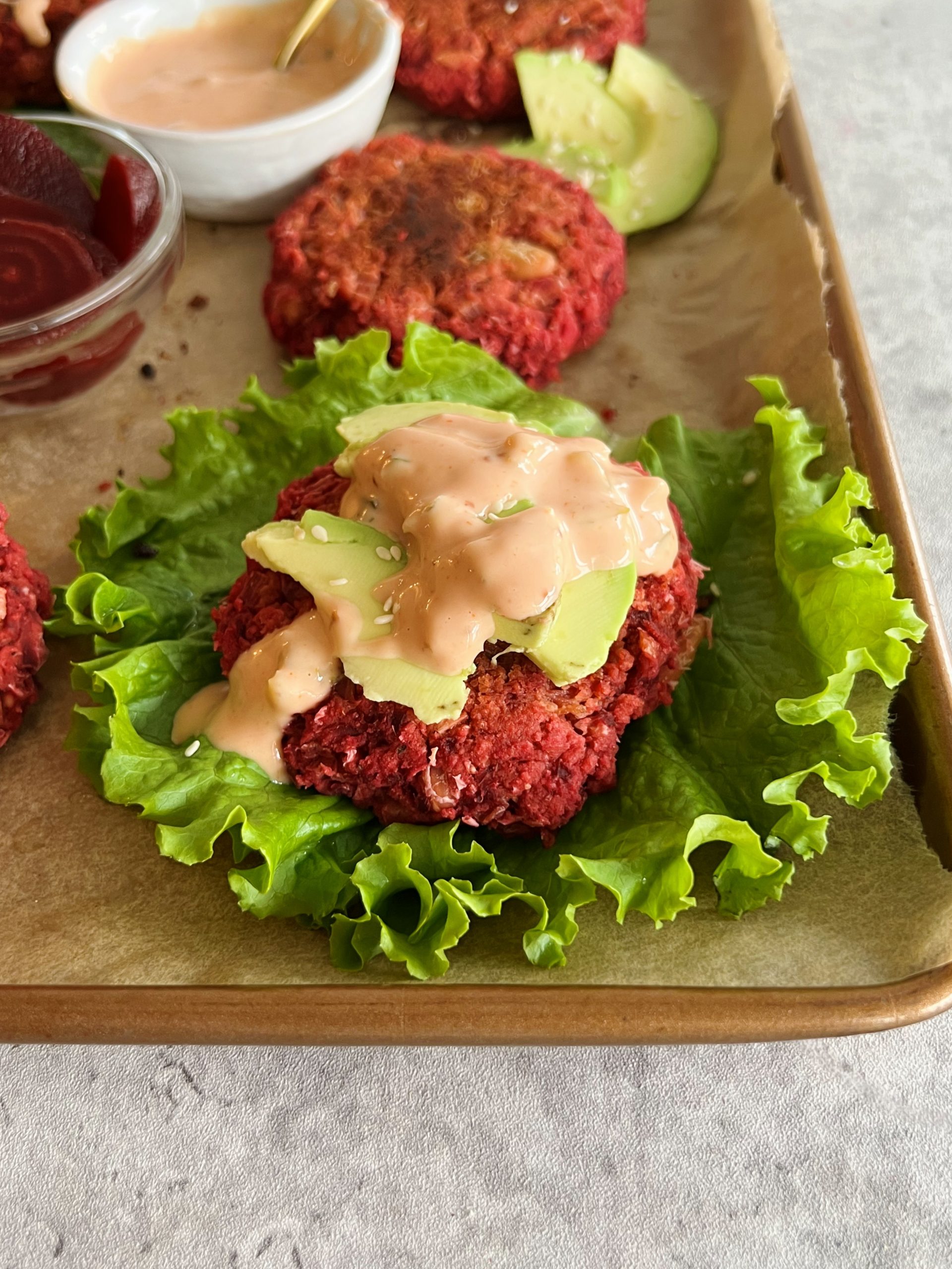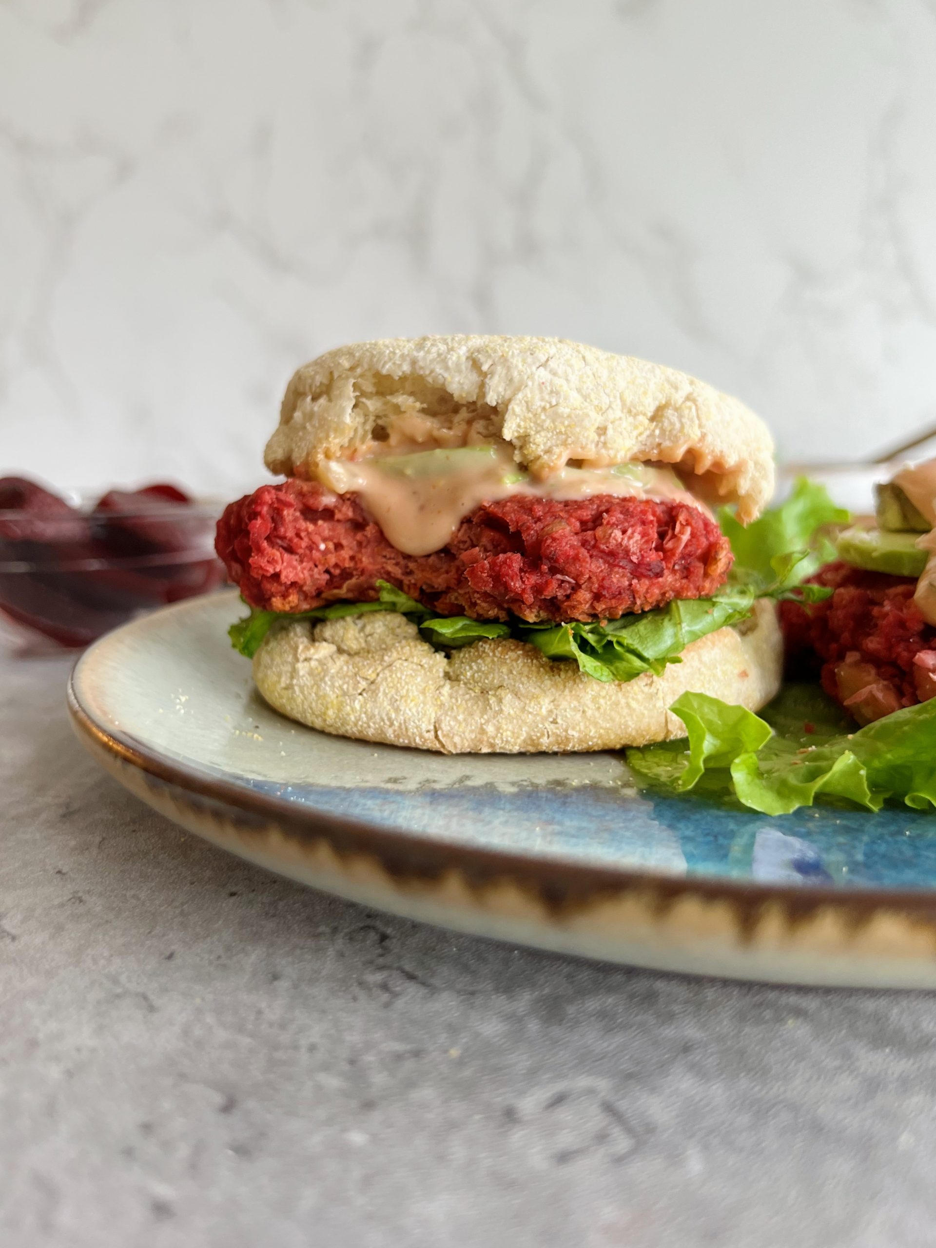 These vibrant and delicious beet burgers are packed with plant-based protein and fiber, and are the perfect veggie burger to meal prep. I love serving them on a toasted english muffin or wrapped in lettuce with a homemade burger sauce. It adds the perfect tang to these burgers, and adds the best flavor.