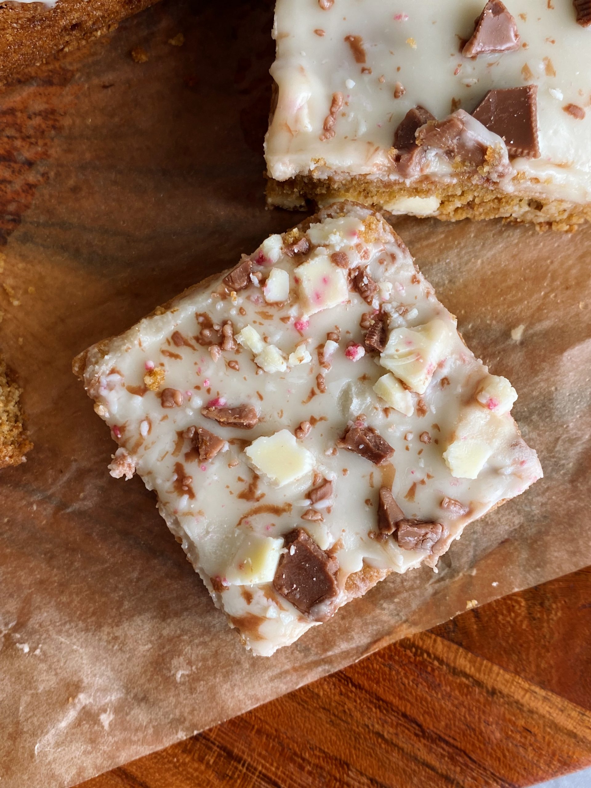 They’re topped with a simple vanilla peppermint icing made from store-bought vanilla frosting and peppermint extract. The icing truly brings all the flavors together and gives these cookie bars an extra hint of holiday flavor.