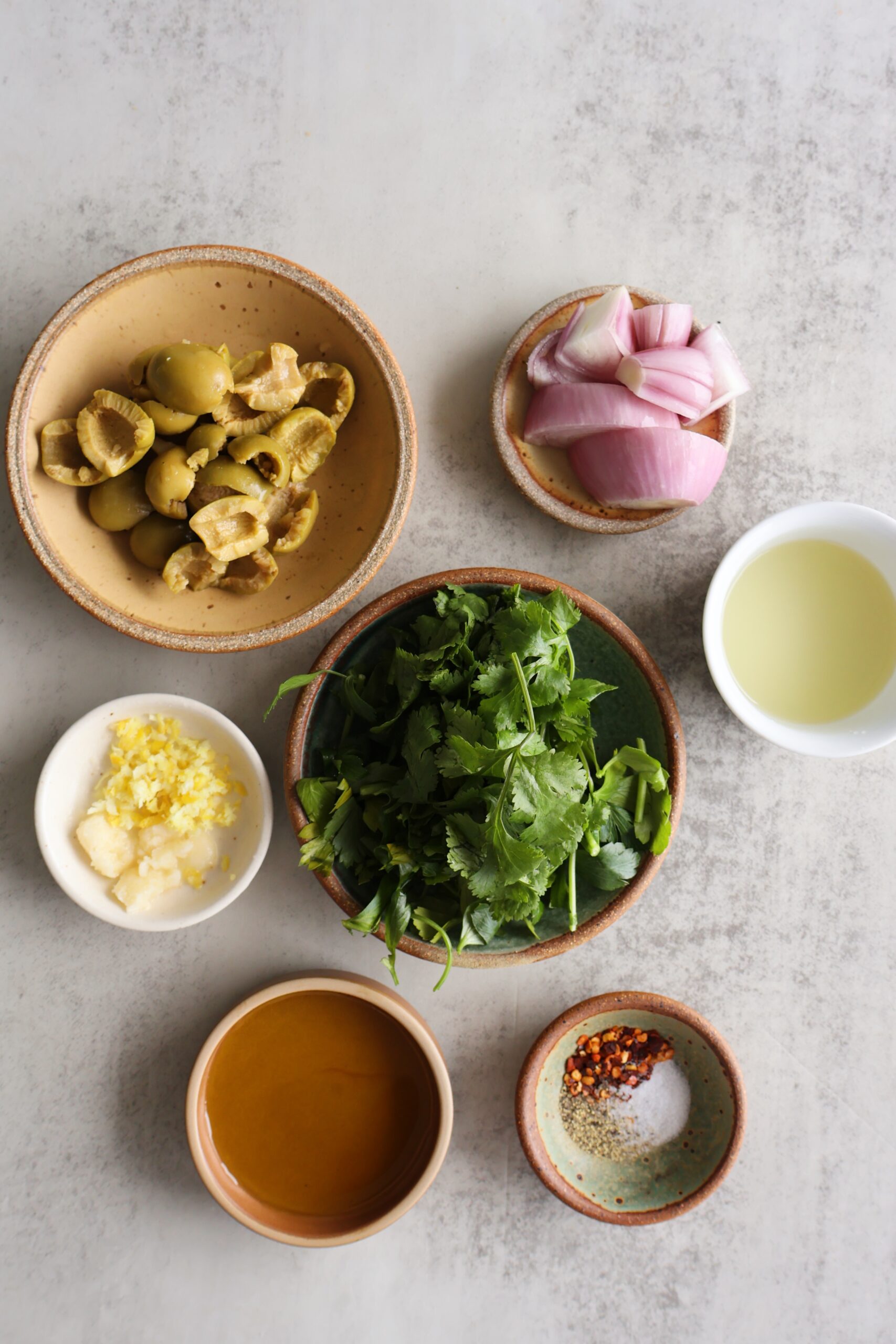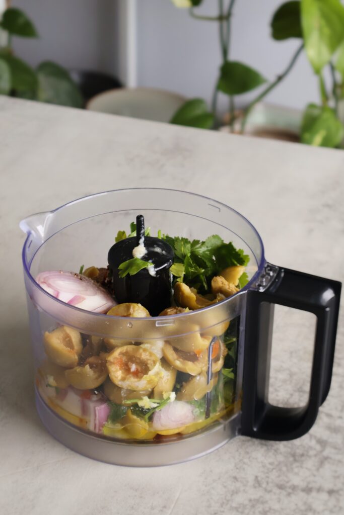 - While the chicken and couscous cook, prepare the olive salsa by adding all of the ingredients to a small food processor and pulsing together until finely chopped. Alternatively, you can finely dice the olives, herbs and shallots and mix with the remaining ingredients in a bowl to create the salsa instead of blending.