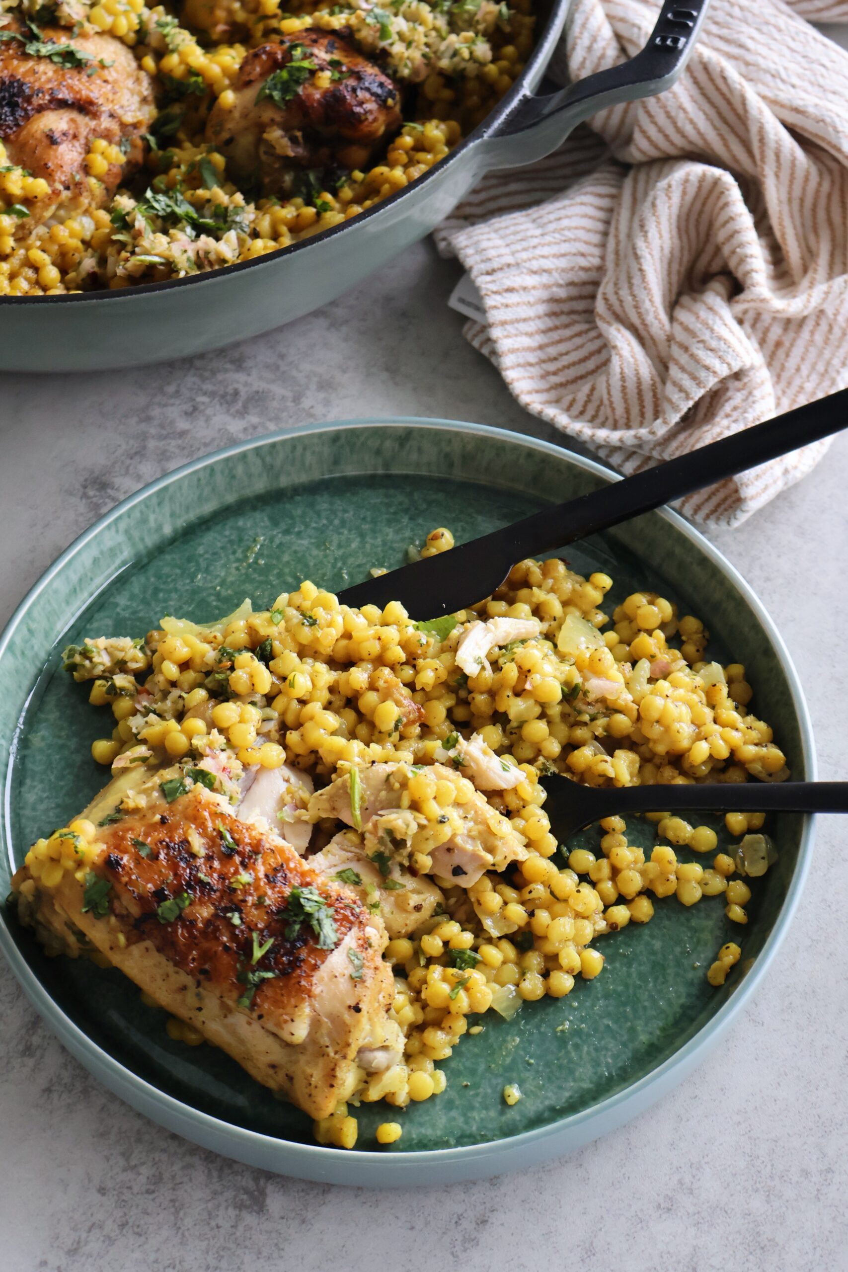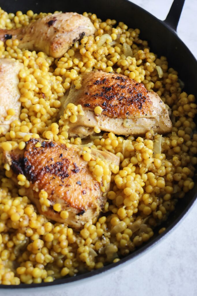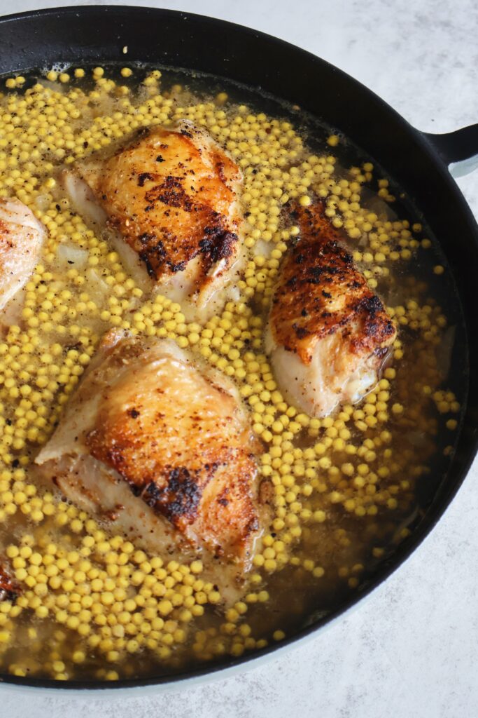 Pearled couscous is a pantry staple of mine that I love preparing in one-skillet dinners or in salads. They’re tiny pearls of pasta that take on any flavor you give them, and pair so well with the flavors in this dish.