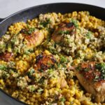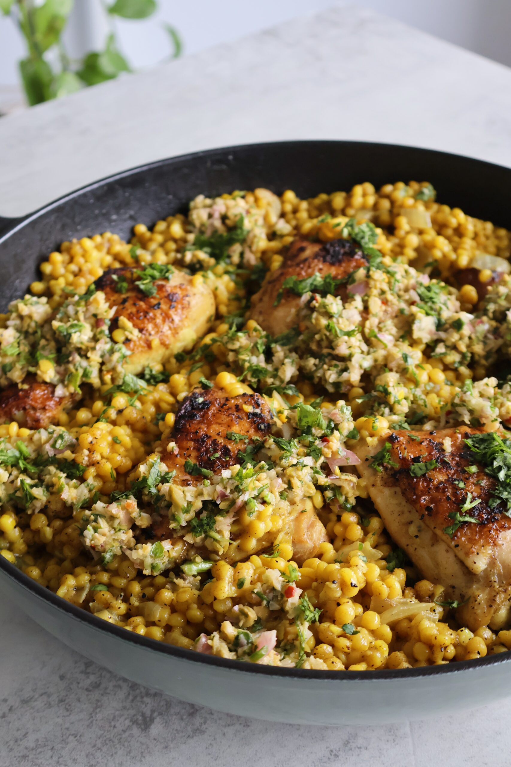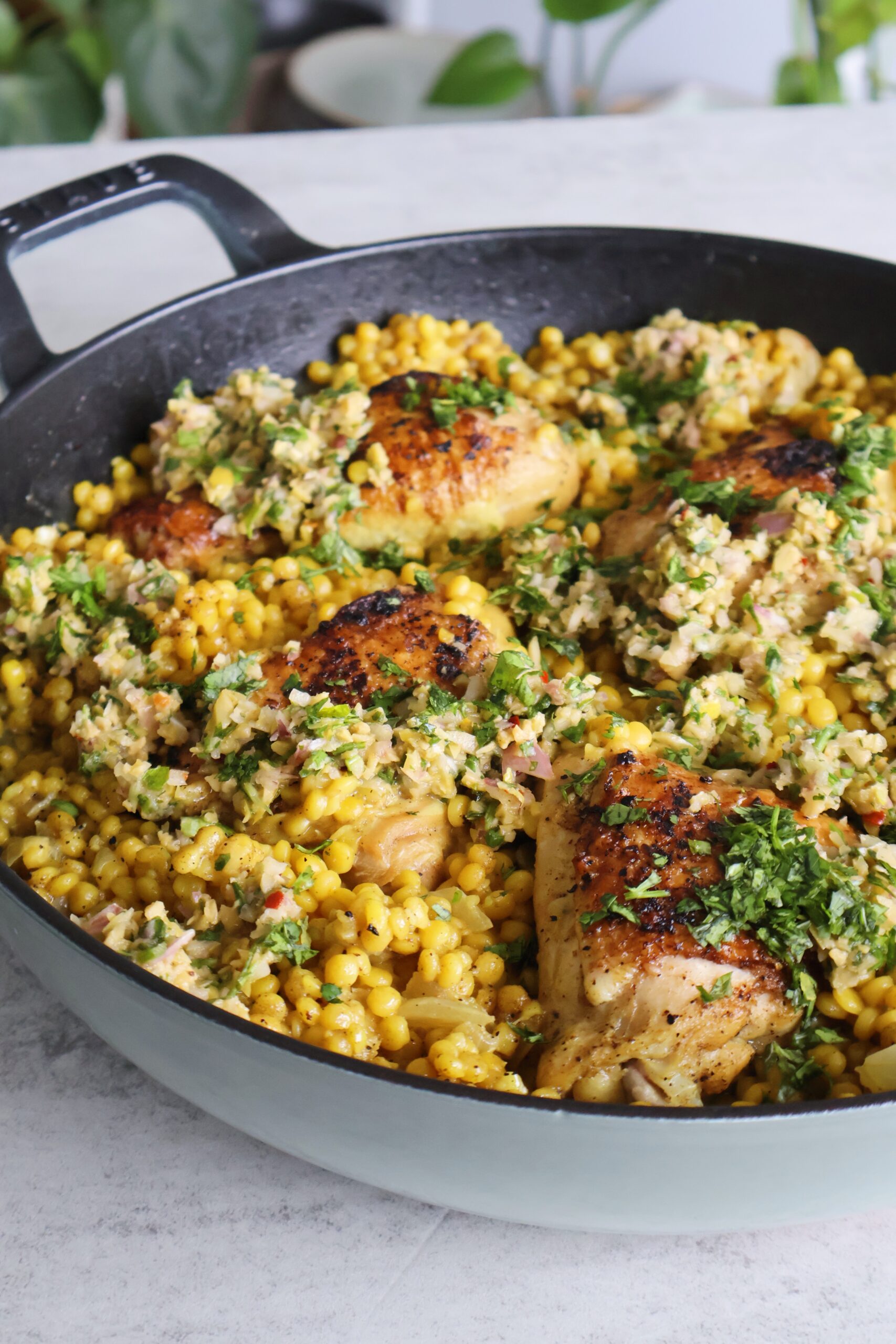 The chicken is seasoned and seared until browned, then cooked in a fluffy za’atar couscous skillet and topped with a zesty olive salsa. Serve it with your favorite simple side salad for a nourishing weeknight dinner.