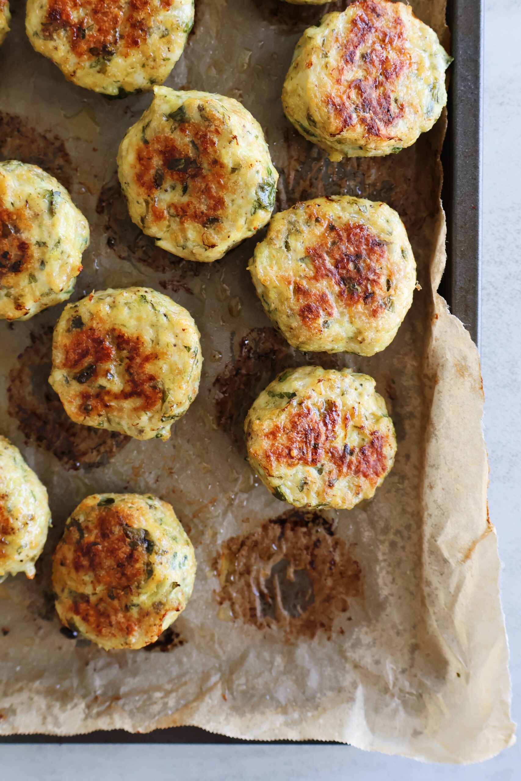 - Bake for about 20-25 minutes until the meatballs are browned, flipping halfway through. *The cooked chicken meatballs can be frozen for up to 3 months.