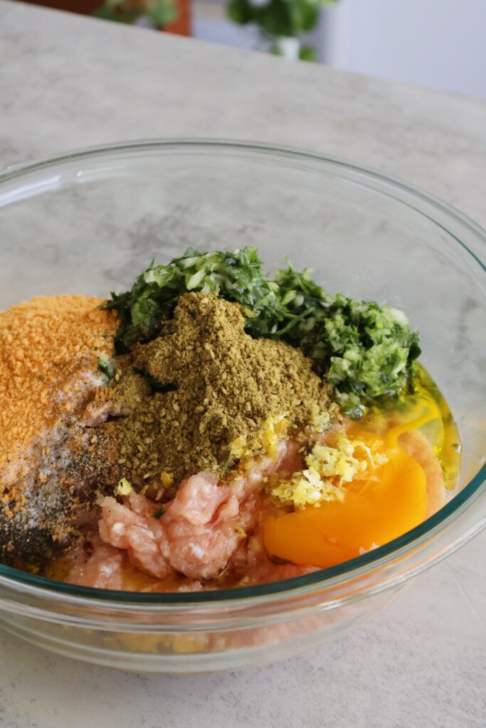 - Add the pulsed mixture to a large bowl with the ground chicken, spices, lemon zest, olive oil, eggs, and breadcrumbs.