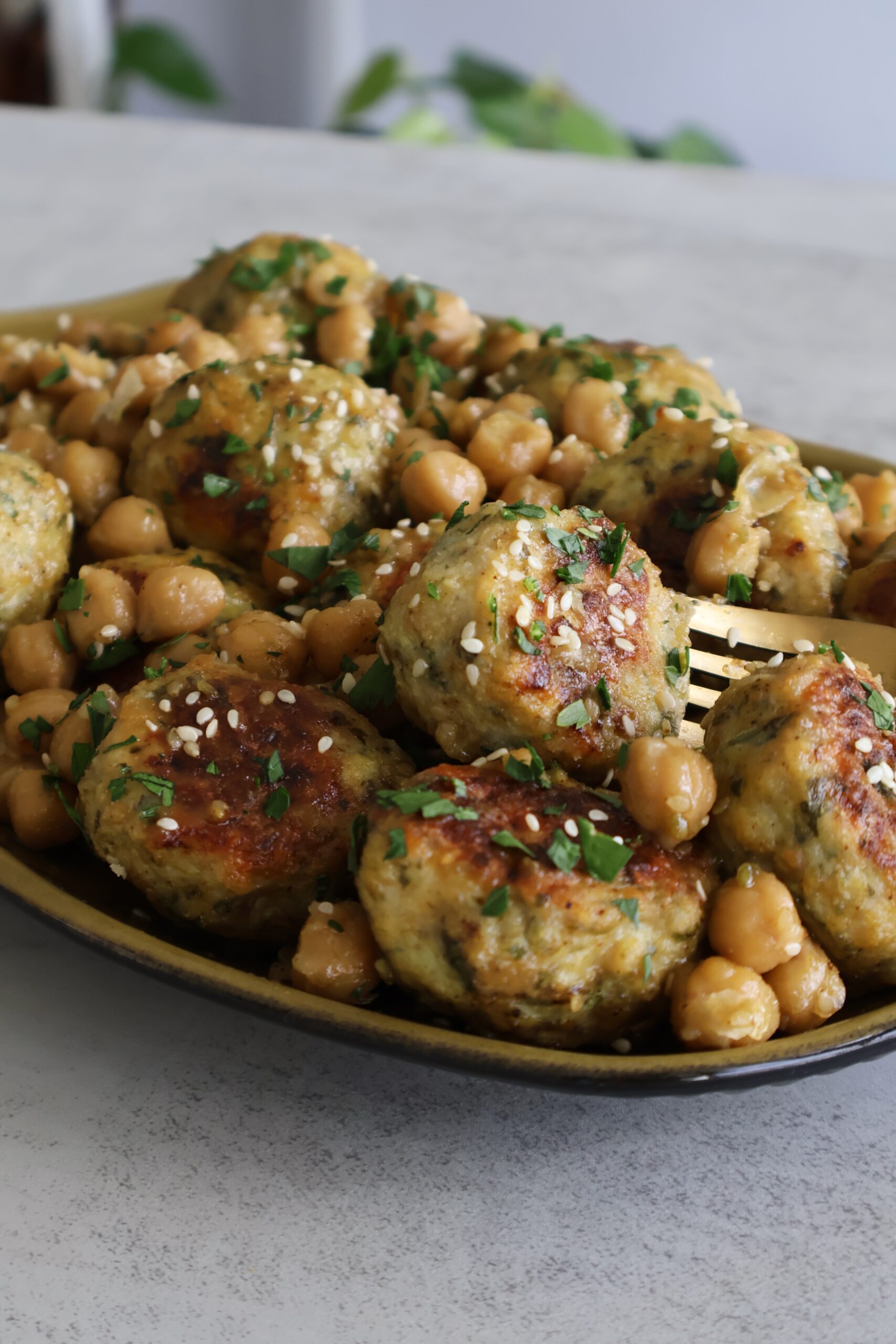 - Toss the cooked meatballs with the chickpeas to coat them in the sauce. Garnish with sesame seeds and chopped parsley when serving.