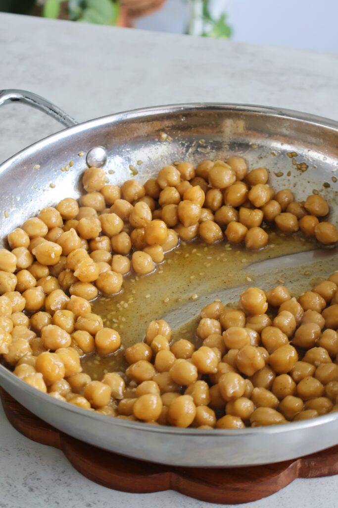- Heat a skillet on medium heat and add in 2 tbsp of olive oil. Add in the chickpeas, lemon juice, honey, za'atar and cumin and cook on medium heat for 5-7 minutes. Taste and add salt if needed.