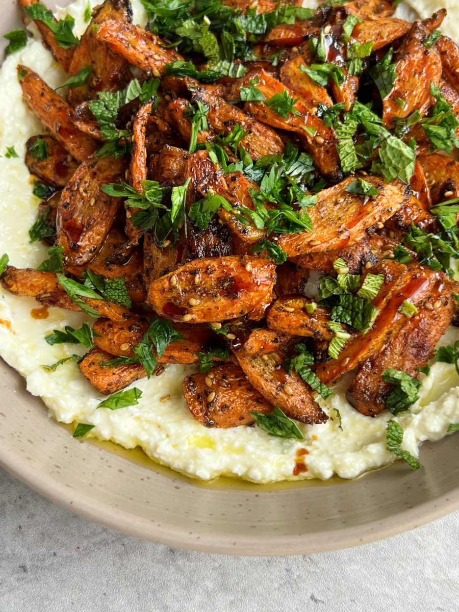 Za’atar roasted carrots served with feta dip and topped with fresh mint and date syrup. The perfect flavorful veggie dish to serve as a side dish or appetizer.