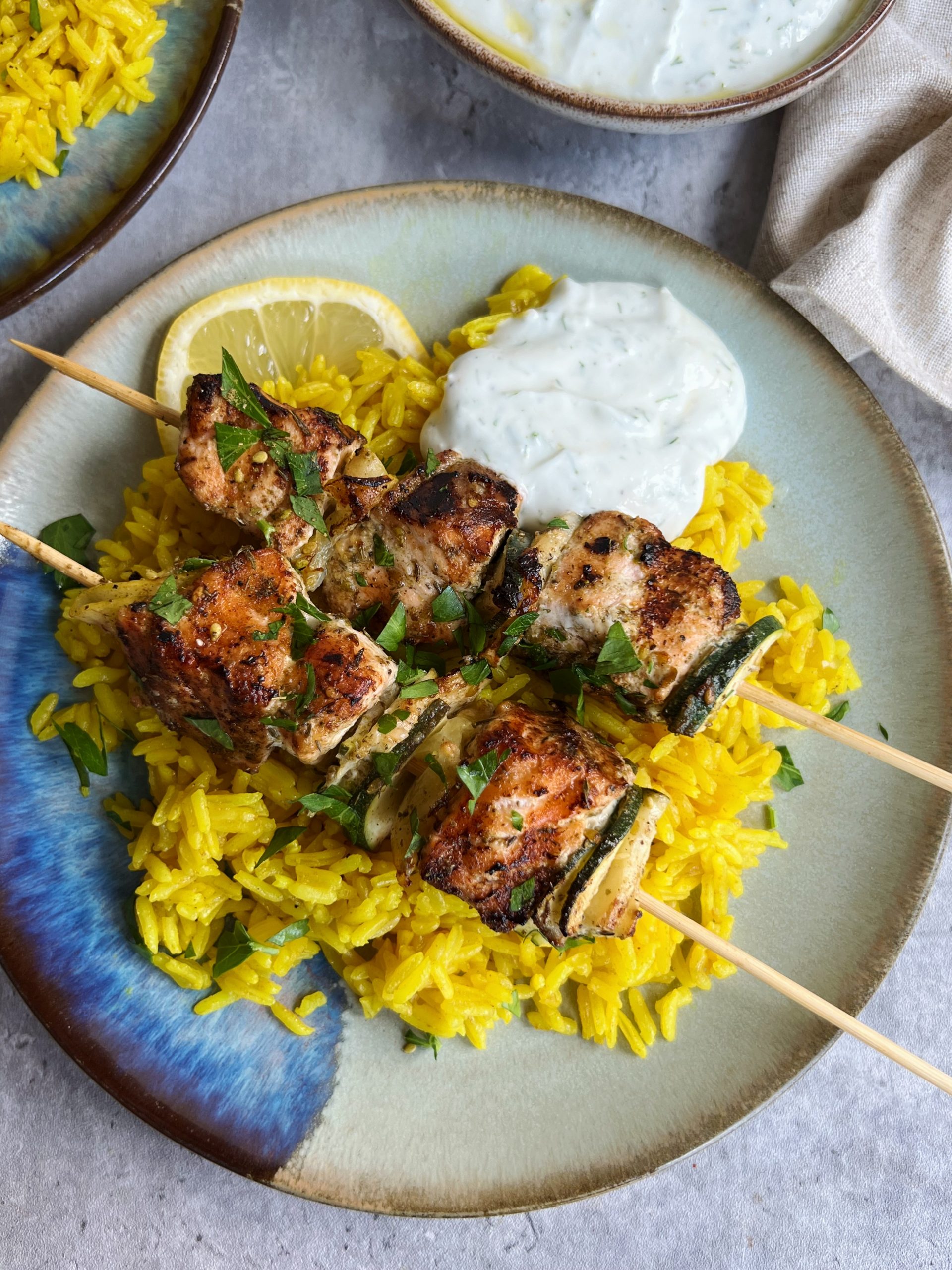 Za’atar salmon skewers with turmeric rice! A flavorful, nourishing meal with some of my favorite middle eastern flavors.