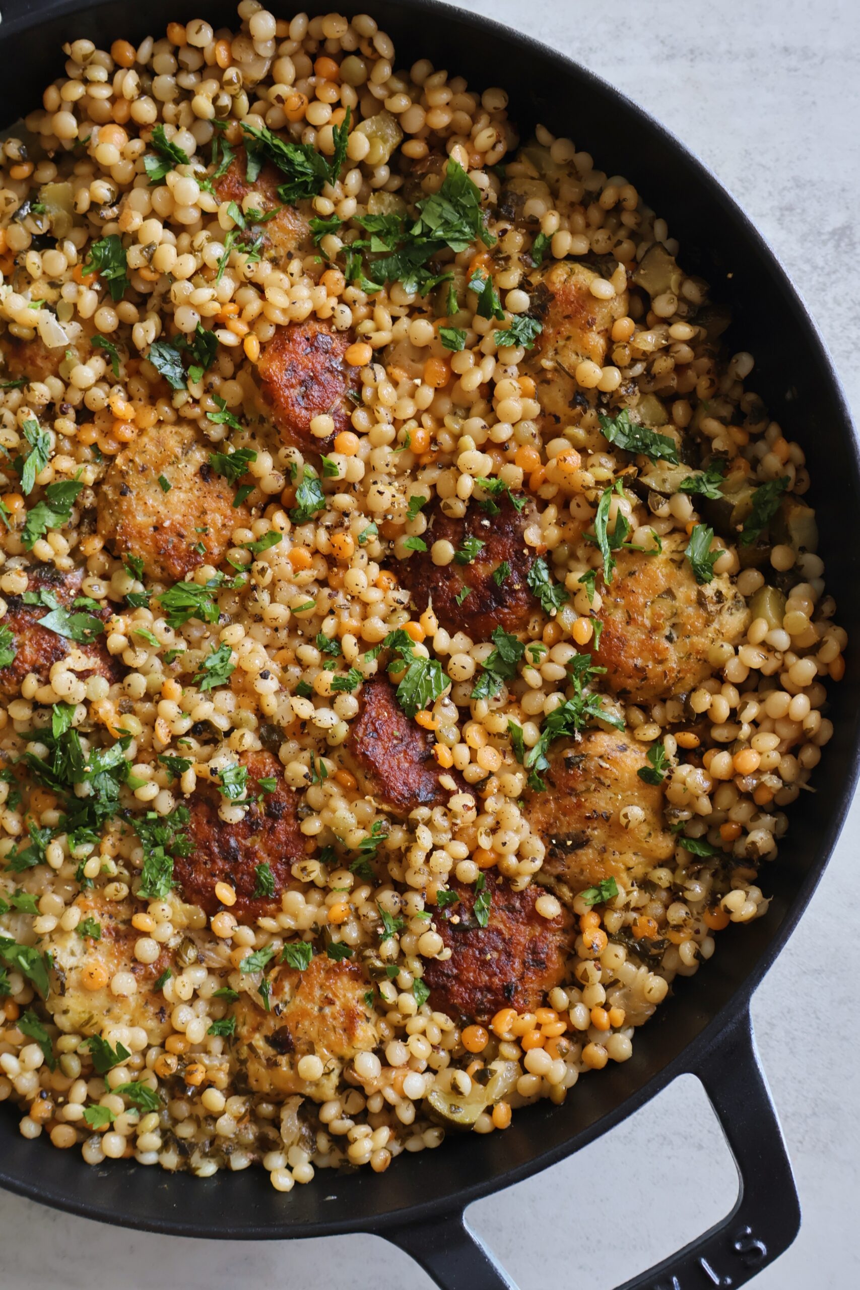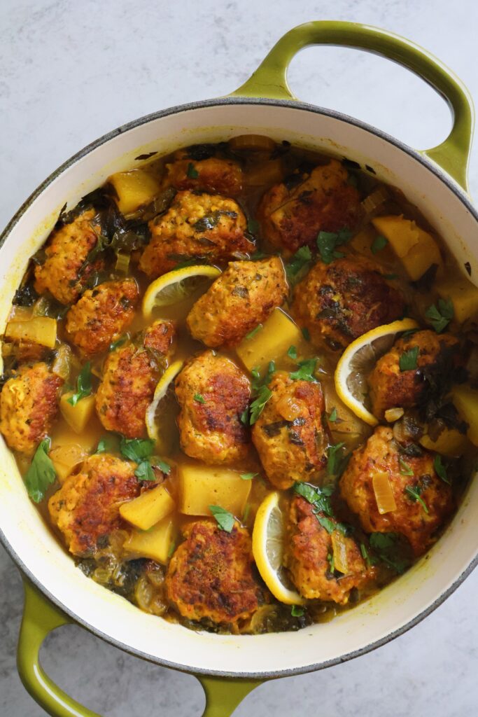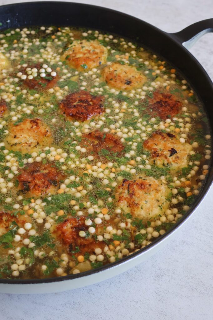 - Pour the water into the pan, then nestle the chicken meatballs back into the couscous.