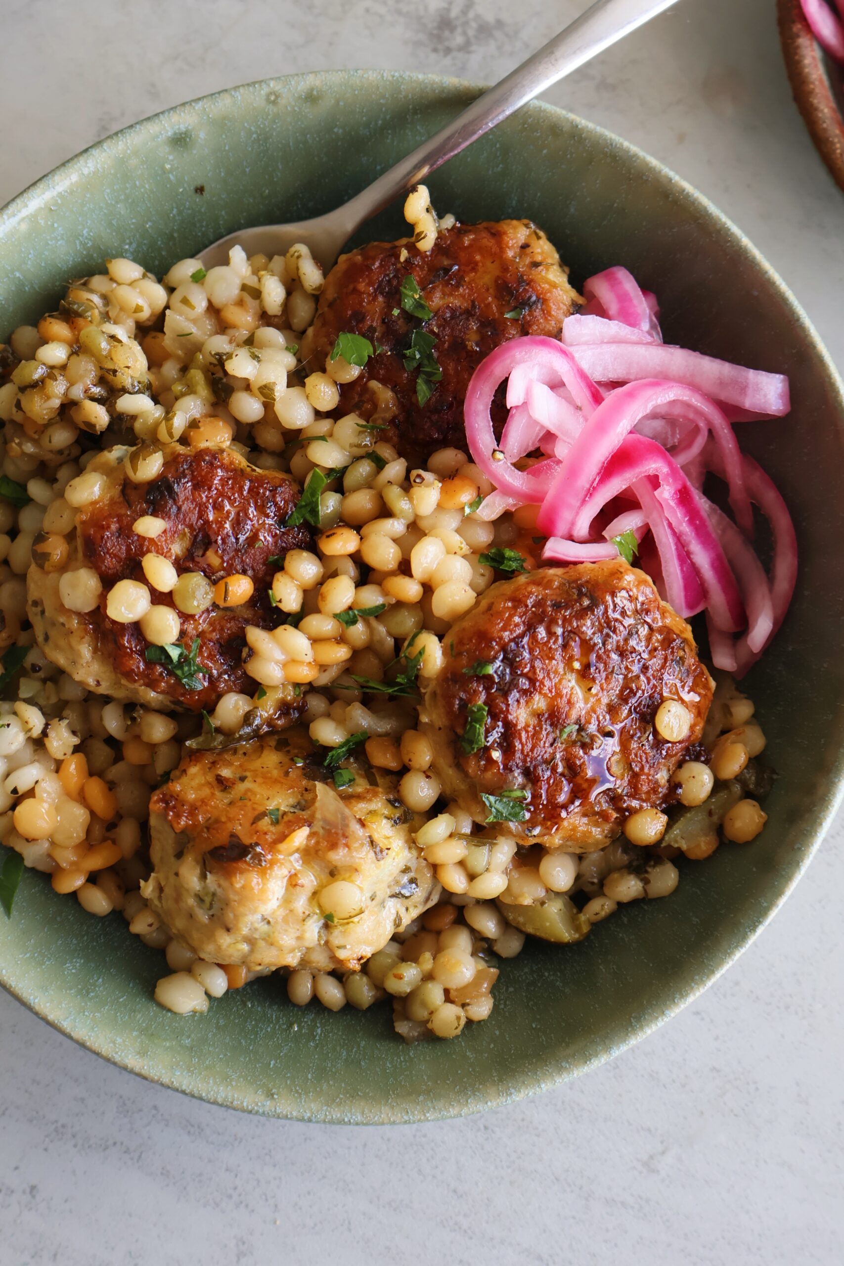 - Remove the chicken meatballs from the pan and add in olive oil. Saute the onion and zucchini until soft, for about 5-7 minutes. Add in the dijon, spices, couscous and parsley and mix