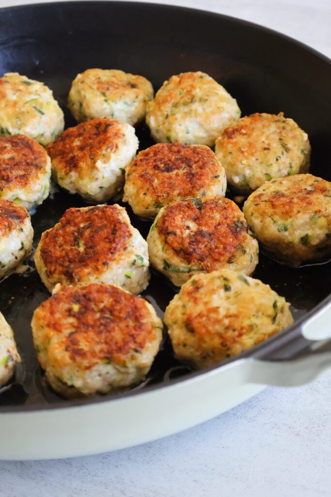 - Heat a large skillet on medium heat. Pour in 1/3 cup olive oil. Once hot, cook the meatballs for about 5 minutes per side, then flip for another 5 minutes. Remove the chicken meatballs from the pan and set aside.