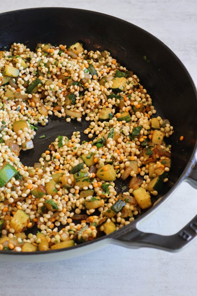 The zucchini does double duty here—it keeps the meatballs moist, and adds a subtle sweetness too. It’s used in both the meatballs and the couscous for an extra boost of veggies.